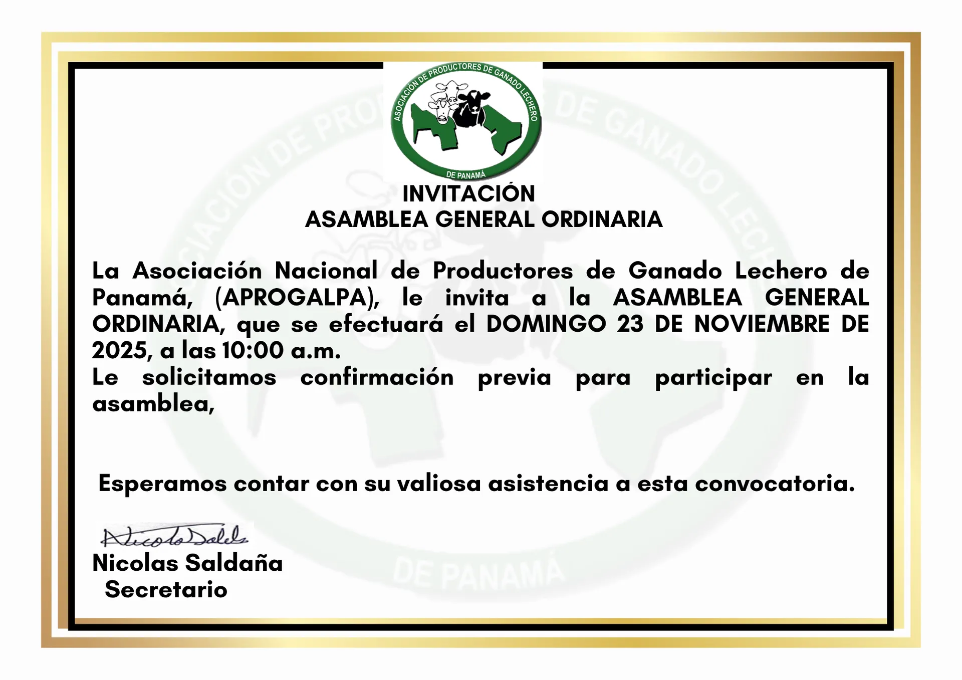 La Asociación Nacional de Productores de Ganado Lechero de Panamá (APROGALPA) invita cordialmente a todos sus miembros a participar en la Asamblea General Ordinaria que se realizará el domingo 23 de noviembre de 2025, a las 10:00 a.m. Se solicita confirmación previa de asistencia para la correcta organización del evento.